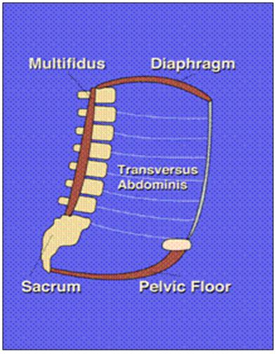 Figura 1. Esquema de los músculos que componen el Core. Donde diaphragm= diafragma; pelvil floor= piso plevico; multifidus= multfido; Transversus abdominis= transverso abdominal.