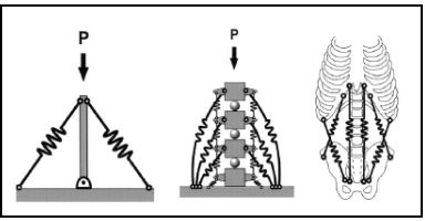 Figura 3. A) Incrementando el stiffness de los cables (músculos) se incrementa la estabilidad y se incrementa la habilidad de soportar grandes fuerzas (P) aplicadas sobre la estructura (columna),sin fallas en la misma. El stiffness de la columna se logra con una compleja interacción de estructuras a largo de la misma (B) y estas formanel core. (C). ( Tomada de McGill, S; 2001).