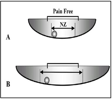 Figura 4. Relación entre la superficie y lapelota(según ejemplo del texto) en la zona neutra y la aparición de las manifestaciones clínicas. A) sistema estabilizado donde la zona neutra está dentro de la zona libre de dolor. B) sistema desestabilizado, donde la pelota se desplaza fuer de la zona libre de dolor (zona neutra ampliada).