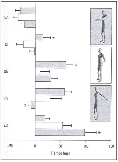 Figura 5. Tiempos de activación de los músculos de la pared abdominal en relación al momento de la activación del deltoides ( T=0) en los movimientos de brazos observados en la figura. Tra=Transverso; OI=Oblicuo Interno, OE= Oblicuo externo; RA= Recto Abdominal. (Hodges,P.W., and Richardson. c.a. 1997).