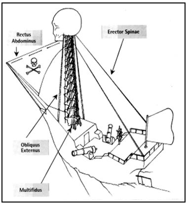 Estos sistemas estabilizadores son vistos, según McGill y Cholewiski (2001), como los cables de acero en la figura siguiente (Figura 6), donde los músculos del SEL unen un segmento con otro de la columna y los músculos del SEG estabilizan de manera distal y global a la columna (salteando varios segmentos vertebrales), especialmente por su orientación relativa al eje de la columna (Figura 6).