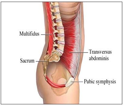 Figura 7. Puede observarse la localización del transverso abdominal (transversus abdominis), y el multifido del raquis (multifidus). Sacrum= sacro; Pubic Synphysis= Sínfisis Púbica.