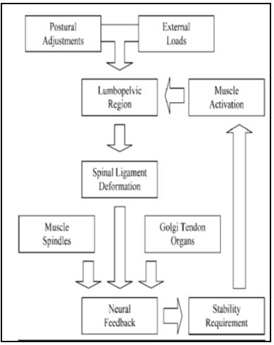 Figura 10. Gráfico del control sensorio motor del Core. Postural Adjustments= Ajustes posturales; External Loads= Cargas Externas; Lumbopelvic Región= Región Lumbopelvica; Spinal Ligament Deformación= Deformación de los Ligamentos Espinales; Muscle Spindles= Husos Musculares, Golgi Tendon Organs= Órganos Tendinosos de Golgi; Neural Feedback= Feedback Neural; Stability Requirement= Requerimientos Estabilitatorios; Muscle Activación= Activación Muscular. Tomado de Willardson J; 2007.